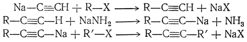 1. Образование ацетиленидов. Чрезвычайно характерным свойством ацетилена и его гомологов типа R—С≡СН является способность замещать на металлы атомы водорода, находящиеся у тройной связи. При действии натрия или амида натрия на ацетилен могут получиться два соединения: HC≡CNa и NaC≡CNa, из аллилена — лишь одно: СН3—C≡CNa. Действием галоидных алкилов на такие металлические производные могут быть синтезированы одно- и двузамещенные ацетилены: