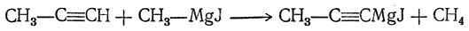 2. Образование магнийорганических соединений. При действии алкилмагнийиодида на ацетиленовые углеводороды, содержащие атомы водорода у тройной связи, получаются магнийорганические соединения ацетиленовых углеводородов (Ж. И. Иоцич):