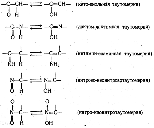 Если таутомерия обусловлена перемещением в молекуле атомов или групп атомов в виде катионов, то такие процессы называются катионотропными таутомерными превращениями. Во многих изученных случаях таутомерия обусловлена миграцией катиона водорода (протона) от одного атома молекулы к другому. Такие таутомерные превращения называются прото-тропными; они обусловливают, например, следующие виды таутомерии: