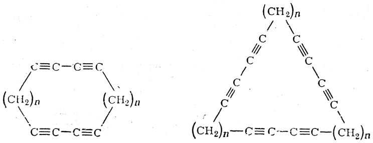 Дипропаргил и его гомологи типа НС≡С—(СН2)n—С≡СН при нагревании в присутствии уксуснокислой меди дают циклические димеры, тримеры и т. д., например: