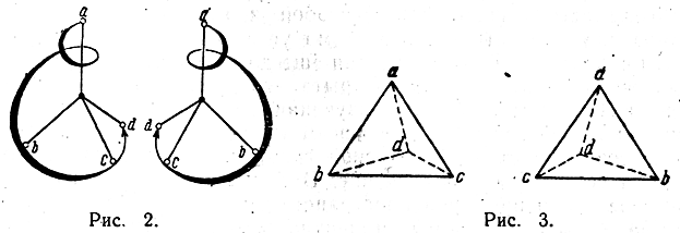 Эти фигуры ни при каком вращении в пространстве не могут совпасть друг с другом. Если из четырех точек а, b, с, d две любые точки совпадают, то остальные две точки окажутся расположенными в противоположных углах тетраэдра. Молекулы, построенные в пространстве аналогично изображенным схемам, следовательно, не тождественны, а различны; поэтому должны быть различны и составленные из этих молекул вещества.