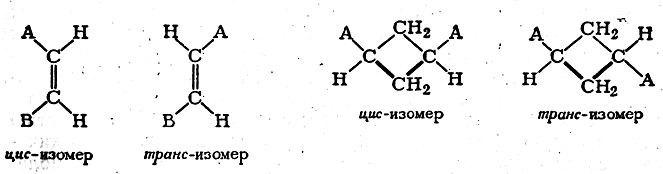 Легко видеть, что такого рода стереоизомеры не относятся друг к другу, как предмет к своему зеркальному изображению. Расстояния между заместителями у транс-изомеров всегда иные, чем у цис-изомеров. Отличия в строении цис- и транс-изомеров больше, чем в строении оптических антиподов. Вследствие этого цис-и транс-изомеры существенно различаются как по физическим, так и по химическим свойствам.
