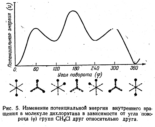 На рис. 5 приведено изменение потенциальной энергии внутреннего вращения в молекуле дихлорэтана. Можно видеть, что по мере поворота групп СН2Сl вокруг оси углерод-углеродной связи энергетическая кривая проходит через минимумы и максимумы. Минимумы энергии отвечают термодинамически наиболее устойчивым конформациям (поворотным изомерам).