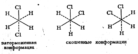 Таким образом, дихлорэтан представляет собой динамическую смесь трех конформаций: наиболее устойчивой заторможенной, или транс-конформации (φ = 0° и 360°), и двух так называемых скошенных конформаций (φ = 120° и 240°), которые обладают одинаковой энергией: