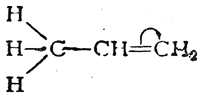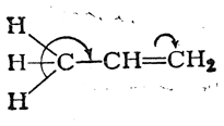 которая выражается, например, в дипольном моменте молекулы пропилена (0,35 D). Смещение π-электронной пары, очевидно, связано с некоторым смещением σ-электронов связей С—Н метильной группы в том же направлении. Обычно это изображают следующим образом: