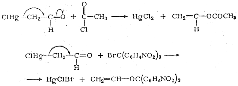 Сопряжение связей Hg—С и С=О достигает здесь такой степени, что ряд реакций этого вещества, протекающих с элиминированием ртути, идет не по месту разрыва связи Hg—С, а по кислородному атому группы С=О, т. е. с переносом реакционного центра, например: