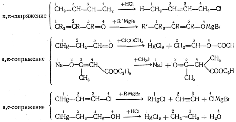 Это сходство особенно ясно видно при сопоставлении типичных реакций π,π-сопряженных систем с реакциями σ,π- и σ,σ-сопряженных систем: