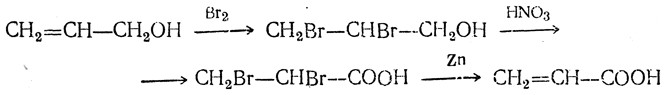 Акриловая кислота СН2=СН—СООН может быть получена из аллилового спирта СН2=СН—СН2ОН присоединением брома с последующим окислением полученного дибромпропилового спирта азотной кислотой в дибромпропионовую кислоту, от которой бром отщепляется при действии металлического цинка: