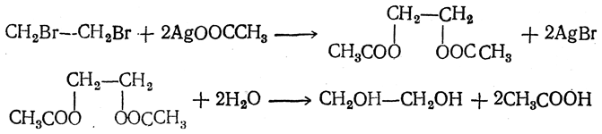 Так, например, можно получать гликоли из дигалоидных соединений, у которых атомы галоида находятся при разных атомах углерода, действием воды