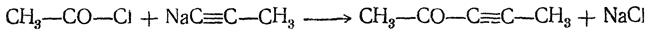 Кроме того, 1,3-дикетоны могут быть получены из кетонов ацетиленового ряда, образующихся при действии хлорангидридов кислот на натриевые производные ацетиленовых углеводородов, например: