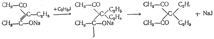 В полученный гомолог исходного дикетона можно снова ввести натрий, тогда становится возможной реакция со второй молекулой галоидного алкила: