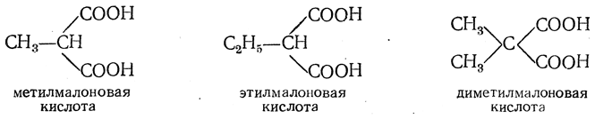 Простейшей двухосновной кислотой является кислота, молекула которой состоит из двух карбоксильных групп НООС—СООН, называемая щавелевой кислотой. Двухосновная кислота с тремя атомами углерода в молекуле — малоновая кислота — может иметь лишь одно строение: НООС—СН2—СООН. Последовательным замещением атомов водорода на метилы можно произвести от малоновой кислоты ряд кислот, являющихся непосредственными ее гомологами. Названия этих кислот обычно и производятся от названия малоновой кислоты: