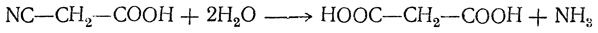 4. Омыление цианзамещенных кислот (мононитрилов двухосновных кислот). Так, например, омылением циануксусной кислоты получается малоновая кислота: