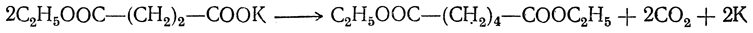 6. Электролиз солей кислых эфиров двухосновных кислот. Эта реакция аналогична синтезу предельных углеводородов путем электролиза солей жирных кислот. Продуктами реакции здесь являются средние эфиры высших двухосновных кислот: