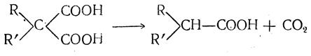 Так как гомологи малоновой кислоты при нагревании отщепляют СО2 и превращаются в предельные одноосновные кислоты, то этим способом можно с помощью малонового эфира синтезировать как саму уксусную кислоту, так и большое число ее гомологов, однозамещенных (т. е. жирных кислот нормального строения) и двузамещенных.