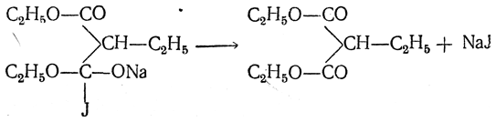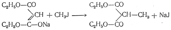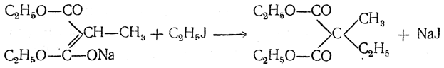 а) Синтез гомологов малоновой кислоты и одноосновных кислот действием иодистых алкилов (синтезы Конрада). При действии иодистых алкилов на натриймалоновый эфир натрий замещается на алкил и получаются моноалкилмалоновые эфиры, например: