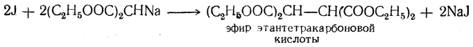 б) Синтез четырехосновных кислот и кислот ряда янтарной кислоты. При действии иода на натриймалоновый эфир и его гомологи два остатка малонового эфира соединяются в молекулу эфира четырехосновной кислоты: