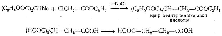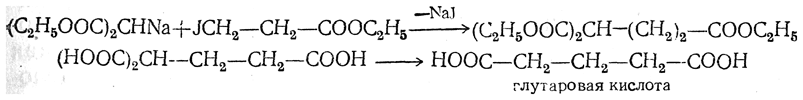 в) Синтез многоосновных кислот при помощи эфиров галоидзамещенных кислот. Действием на натриймалонозый эфир (и его гомологи) эфиров галоидзамещенных одноосновных кислот можно получить эфиры трехосновных кислот, а омылением этих эфиров с последующим отщеплением CO2 получаются двухосновные кислоты: