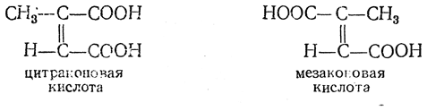 Итаконовая кислота плавится при 163° С. Цитраконовая кислота (т. пл. 91° С) легко превращается в мезаконовую (т. пл. 240,5°С), отношения которой к цитраконовой вполне тождественны отношениям малеиновой кислоты к фумаровой. Поэтому цитраконовой кислоте приписывают конфигурацию цис-кислоты (метилмалеиновой), а мезаконовой — конфигурацию транс-кислоты (метилфумаровой):