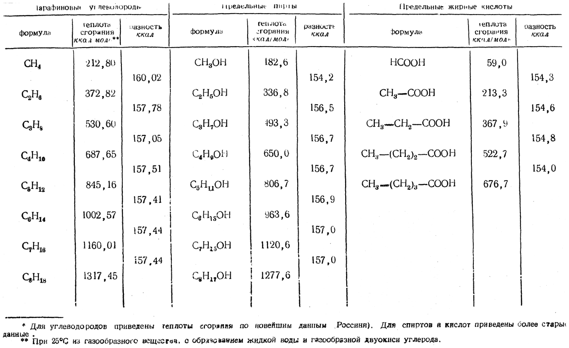 Наиболее общая закономерность состоит в том, что разность молярных теплот сгорания для двух ближайших гомологов нормального строения, отвечающая гомологической разнице состава СН2, является величиной постоянной, в среднем равной 157,4 ккал (табл. 25).