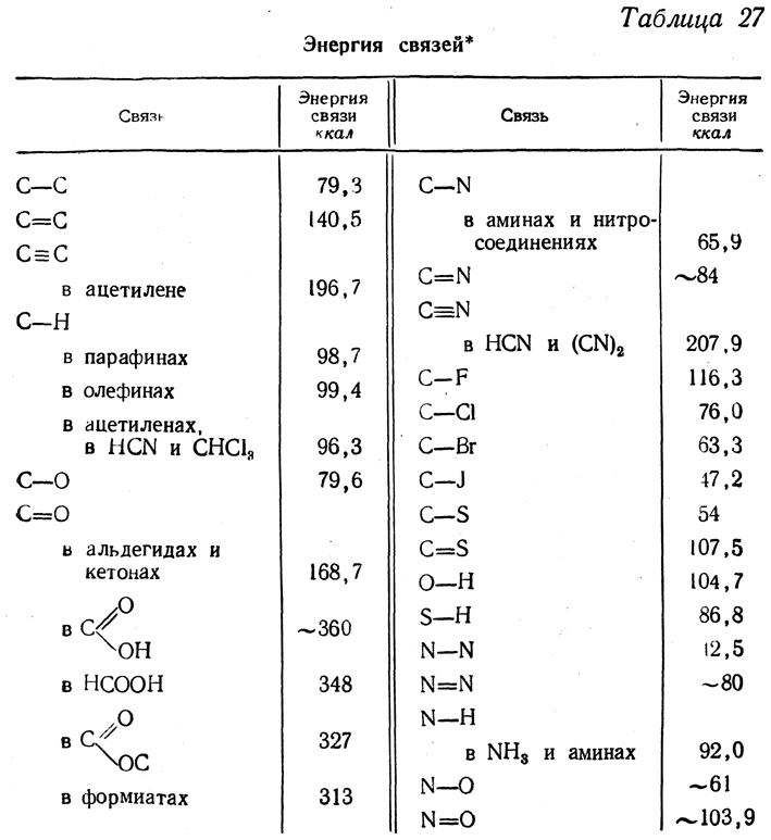 380,05 ккал/моль, средняя энергия каждой из четырех связей С—Н составит 1/4 этой величины, или 83,56 ккал. Этим путем можно подсчитать энергии ряда связей (или целых группировок связей) и, пользуясь полученными величинами, подсчитывать теплоты образования различных соединений. Расчеты теплот образования органических соединений по этим величинам дают довольно хорошие результаты, за исключением начальных членов гомологических рядов. При расчете нужно учитывать также увеличение теплот образования у более разветвленных (и более симметричных) изомеров. В табл. 27 приведены энергии различных связей.