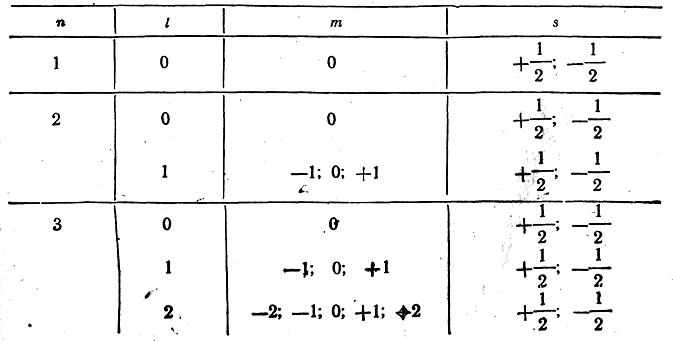 Согласно принципам квантовой механики, состояние электрона в атоме характеризуется четырьмя так называемыми квантовыми числами: п, l, т и s, где п — главное квантовое число, в основном определяющее энергию электрона; l — орбитальное (побочное) квантовое число, характеризующее момент количества движения электрона; т — магнитное квантовое число, характеризующее проекцию момента количества движения электрона на некоторое выделенное направление, а именно — направление внешнего магнитного поля; s — спиновое квантовое число, характеризующее некоторый дополнительный момент количества движения электрона, присущий самому электрону. На квантовые числа l, т и s накладываются следующие ограничения: l не может быть больше, чем главное квантовое число минус единица; т может принимать 2l +1 различных значений