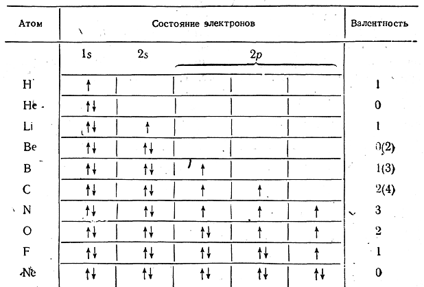 Как видно из таблицы, соответственно числу неспаренных электронов водород, литий и фтор одновалентны, азот трехвалентен, кислород двухзалентен, что согласуется с опытом и квантовой теорией валентности. Все электроны атомов гелия и неона спарены, что также вполне согласуется с инертностью этих атомов. В случае бериллия, бора и углерода полученные таким путем числа валентности противоречат опыту (истинные валентности указаны в скобках).