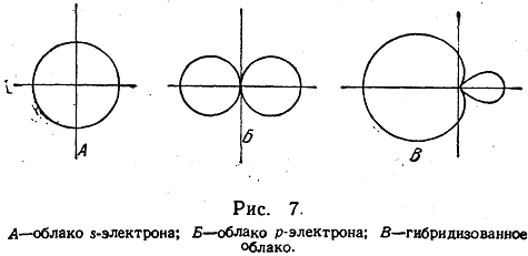 Легко видеть, что четыре связи возбужденного атома углерода 1s22s2p3 с другими атомами должны образоваться за счет трех р-электронов и одного s-электрона, а следовательно, одна из валентных связей по своей пространственной конфигурации должна отличаться от трех остальных, что противоречит всему опыту органической химии. При помощи квантовой механики было, однако, показано, что в действительности облака трех р-электронов и одного s-электрона углерода «гибридизуются» разными способами (см. ниже), например образуются четыре одинаковых «гибридизованных» облака (рис. 7, В), направленных из центра правильного тетраэдра к его вершинам. Такая гибридизация обозначается как sр3-гибридизация.