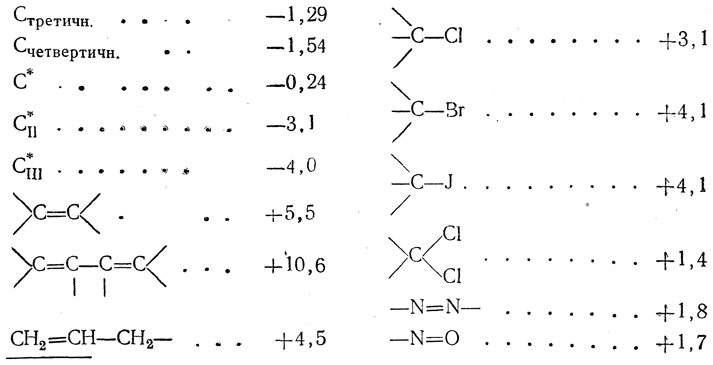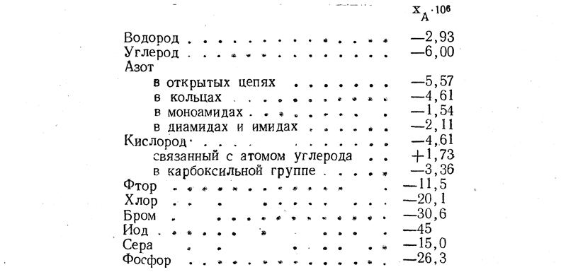 Ниже приводятся значения атомных восприимчивостей для некоторых атомов (знак минус указывает на диамагнетизм, знак плюс — на парамагнетизм):