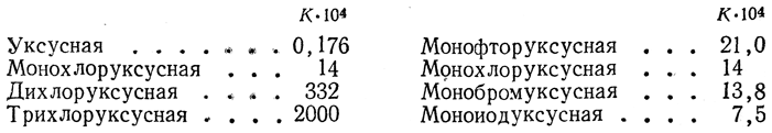 Галоидзамещенные кислоты вступают во все реакции, свойственные карбоновым кислотам. Они образуют соли, сложные эфиры, галоидангидриды, ангидриды, амиды и пр. Введение галоидов в молекулу кислоты увеличивает силу кислоты, как видно из приведенных ниже данных, причем это влияние падает от фтора к иоду: