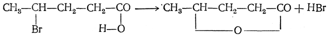 γ-Галоидкислоты при кипячении с водой или щелочью также легко отщепляют галоидоводород, но при этом образуются не непредельные кислоты, а циклические сложные эфиры, называемые лактонами: