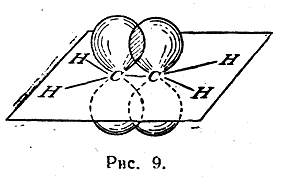 Однако при таком расположении связей в этилене у каждого атома углерода остается по одному неспаренному электрону. Они уже не могут образовать между атомами углерода вторую σ-связь, так как это сопровождалось бы нарушением принципа Паули. Поэтому такие неспаренные электроны атомов углерода образуют качественно иную связь. Перекрывание двух электронных облаков происходит так, что восьмерки этих облаков перпендикулярны плоскости, в которой расположены все шесть атомов молекулы этилена (рис. 9). Такая связь называется π-связью, а электроны, ее образующие, — π-электронами. Так как предполагается, что σ-связи в молекуле этилена образуются с участием гибридизованных электронов, а π-связь — с участием «чистых» р-электронов (т. е. из четырех электронов каждого углеродного атома гибридизованы один s-электрон и только два из трех р-электронов), то гибридизация электронов углеродного атома в молекуле этилена обозначается как sp2-гибридизация.
