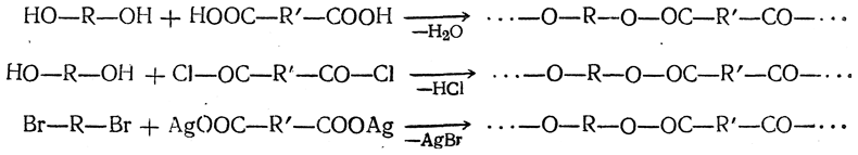 Другой путь образования высокомолекулярных соединений линейного строения заключается в реакциях веществ, содержащих две одинаковые функциональные группы, с другими веществами, содержащими также две функциональные группы, но другого типа. Примером этого являются изученные особенно подробно Карозерсом реакции образования полиэфиров из двухосновных кислот и гликолей. Такие продукты могут быть получены по следующим схемам: