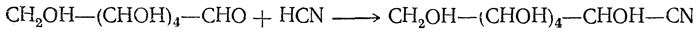 Кроме того, от моносахаридов можно перейти к многоатомным одноосновным оксикислотам, содержащим на один атом углерода больше, чем в соответствующих монозах, посредством циангидринной реакции: