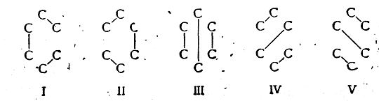 Для того чтобы облегчить расчет волновой функции ψ, отдельные слагаемые (C1ψ1, C2ψ2 и т. д.) условно изображаются графически в виде соответствующих валентных схем, которые используются как вспомогательные средства при математическом расчете. Например, когда указанным способом рассчитывают молекулу бензола и принимают во внимание только π-элек-троны, то таких слагаемых получается пять. Этим слагаемым соответствуют следующие валентные схемы: