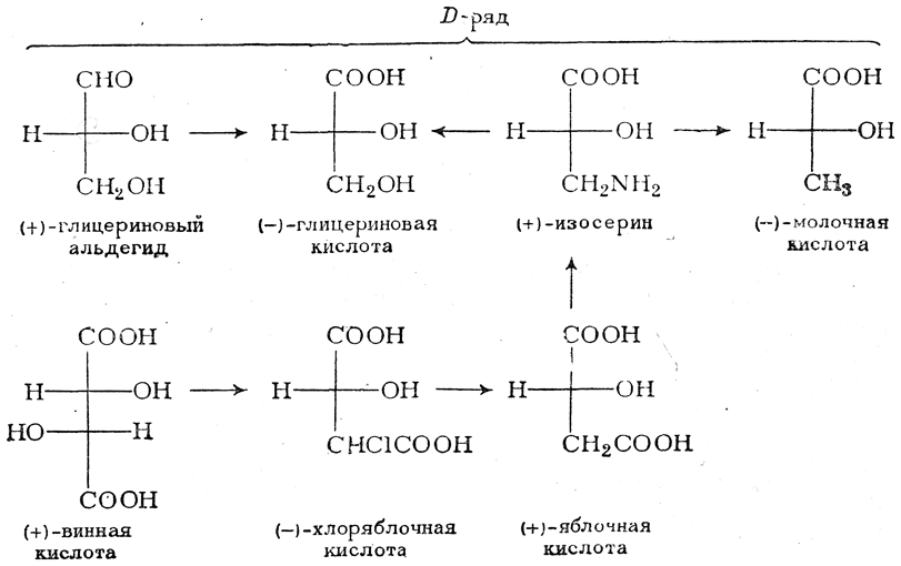 При этом корреляция конфигураций различных веществ чаще всего осуществлялась химическим путем. Например, (+)-глицериновый альдегид был окислен в (—)-глицериновую кислоту, которая была получена также из (+)-изосерина при его диазотировании; (+)-изосерин в свою очередь был дезаминирован с образованием (—)-молочной кислоты и получен из (+)-винной кислоты через (—)-хлоряблочную и (+)-яблочную кислоты: