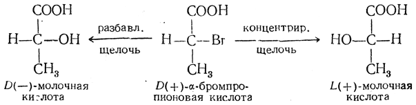 Если же замещение происходит непосредственно при асимметрическом центре, то конфигурация молекулы может измениться. Например, из D(+)-α-бромпропионовой кислоты при действии на нее разбавленной щелочи получается D(—)-молочная кислота, а при действии концентрированной щелочи — L(+)-молочная кислота: