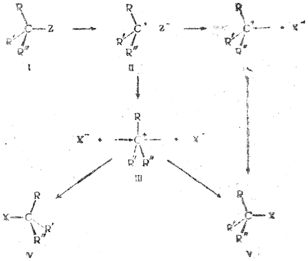 При бимолекулярной реакции по мере приближения аниона X– к молекуле I происходит постепенное удаление радикала Z и одновременное отталкивание трех остальных заместителей, так что в переходном состоянии II эти заместители находятся в одной плоскости. Последующее отщепление аниона Z– и образование связи между центральным атомом и новым заместителем X приводит к конфигурации (III), которая являлась бы зеркальным отражением исходной конфигурации (I), если бы X был тождественен Z: