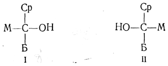 При этом соединение IV получится в несколько большем количестве, чем V, так как присоединение метальной группы к кетонному карбонилу в молекуле кетоэфира III происходит легче со стороны заместителя Ср (из-за плоскости чертежа), чем со стороны большего по размерам заместителя Б. Поэтому после омыления смеси сложных эфиров IV и V получится смесь L(+)- и D(—)-атролактиновых кислот, в которой преобладает L(+)-форма, вследствие чего эта смесь кислот не является рацемической, а вращает плоскость поляризации света вправо. Если бы исходный спирт обладал конфигурацией II, то в результате тех же превращений получилась бы атролактиновая кислота, содержащая избыток молекул D(—)-антипода и потому вращающая влево. Таким образом, определив направление вращения получившейся атролактиновой кислоты, можнo установить пространственное строение исходного спирта. Этот метод позволил выяснить абсолютные конфигурации в ряду терпенов, стероидов и некоторых других сложных природных соединений.