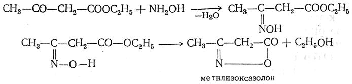 4. Действие г и д р о к с и л а м и н а. Оксим, который должен был бы образоваться в результате реакции с гидроксиламином, превращается с отщеплением молекулы спирта в метилизоксазолон: