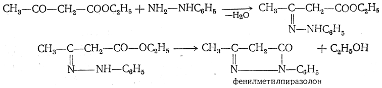 5. Действие фенилгидразин а. При действии фенилгидразина, как и при реакции с гидроксиламином, получается гетероциклическое соединение — фенилметилпиразолон: