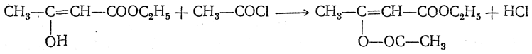 6. Действие галоидангидридов. Действием галоидангидридов в присутствии органических оснований (пиридина) получаются сложные эфиры оксикротонового эфира: