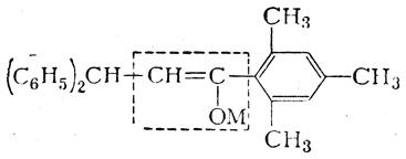 явствует из результатов исследований (А. Н. Несмеянов и сотр.) натриевых, литиевых и магниевых енолятов дифенилпропиомезитилена — соединения, вполне аналогичного ацетоуксусному эфиру. Этот енолят имеет следующее строение (пунктиром выделена часть молекулы, имеющаяся и в натрийацетоуксусном эфире):