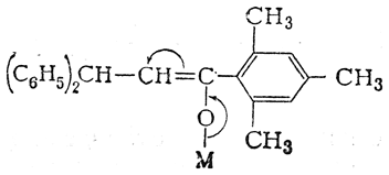Отсутствие таутомерии здесь доказывается существованием цис- и транс-форм енолятов, выделенных в индивидуальном виде и не способных к взаимному превращению в растворах. Стереоизомерные еноляты способны к образованию и С-производных и О-производных, причем при образовании О-производных не изменяется пространственная конфигурация молекулы. Следовательно, рассматриваемое соединение может иметь строение только енола и его двойственная реакционная способность не вызвана таутомерией. Способность енолятов дифенилпропиомезитилена образовывать не только О-производные, но и С-производные может быть объяснена как результат эффекта сопряжения и переноса реакционного центра от атома кислорода (связанного с металлом) к углероду метинной группы:
