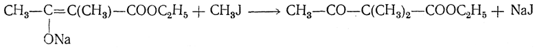 При действии на натрийацетоуксусный эфир всевозможных галоидных соединений радикал, вступающий вместо натрия в молекулу ацетоуксусного эфира, в получаемых соединениях оказывается связанным с атомом углерода. Так, например, из галоидных алкилов и натрийацетоуксусного эфира получаются гомологи ацетоуксусного эфира:
