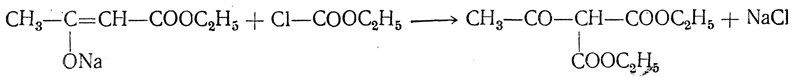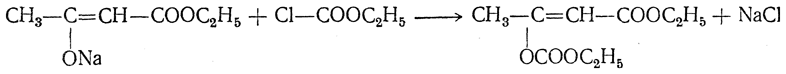 11. Образование О-п р о и з в о д н ы х. В более редких случаях натрийацетоуксусный эфир может реагировать, образуя производные оксикротонового эфира, т. е. радикал, входящий вместо натрия, связывается с кислородом (образуются так называемые О-производные). Преимущественно в этом направлении реагирует с натрийацетоуксусным эфиром хлоругольный эфир: