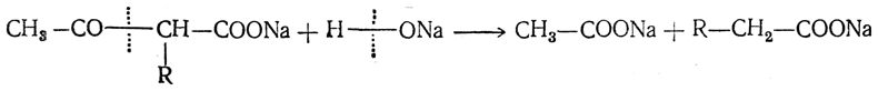 12. Действие кислот и щелочей. Концентрированные щелочи при нагревании производят так называемое кислотное расщепление β-кетонокислот, образующихся в результате омыления ацетоуксусного эфира. При этом молекула β-кетонокислоты распадается на две молекулы одноосновных кислот, например: