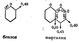 На молекулярных диаграммах бензола и нафталина указаны эффективные заряды (в данных случаях равные нулю), кратности связей (цифры на линиях связей) и индексы свободной валентности атомов (показаны стрелками):