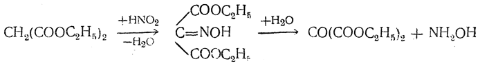 а эфир ее — из малонового эфира действием азотистой кислоты и отщеплением гидроксиламина от образовавшегося изонитрозомалонового эфира: