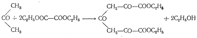 Ацетиндищавелевая кислота СО(СН2—СО—СООН)2. Эфир ее получается конденсацией ацетона с щавелевым эфиром: